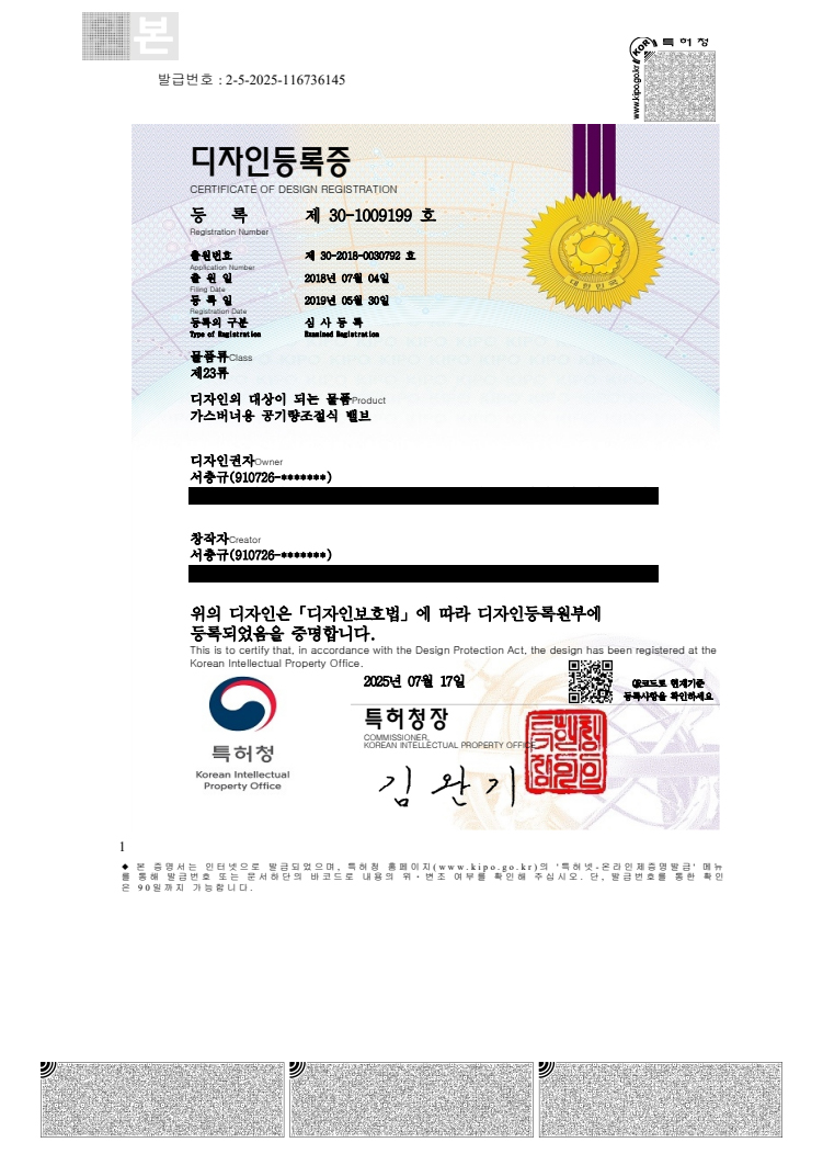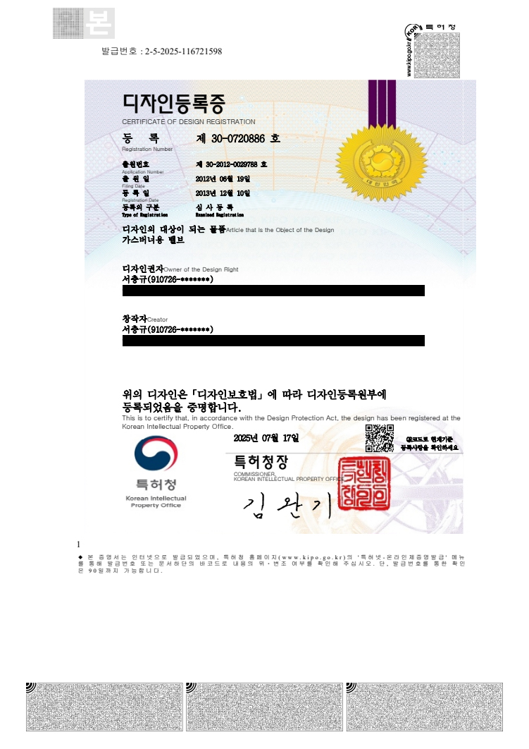 디자인등록증 제30-0693650호