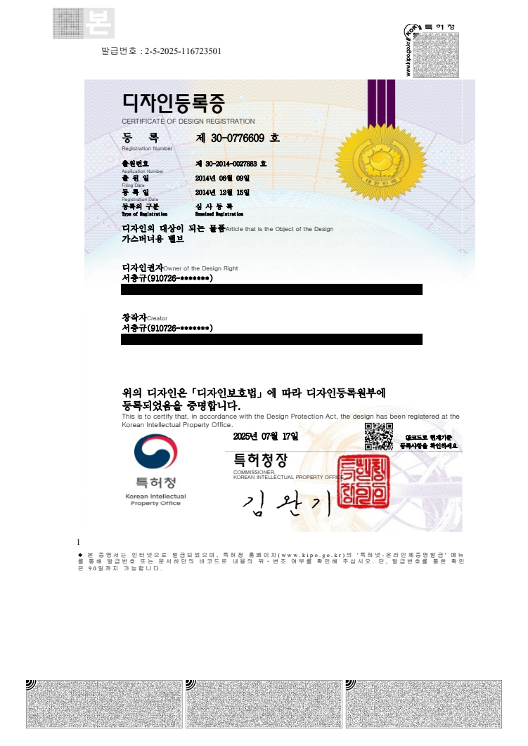 디자인등록증 제30-0776607호